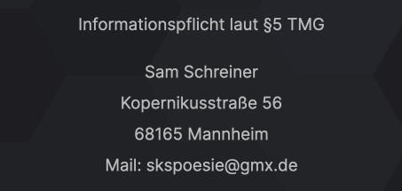 Ich bin Sam K. Schreiner und 1996 geboren. Ich lebe und schreibe in Mannheim, Baden-Württemberg. Seit ich 14 bin, schreibe ich Romane und seit 2014 bin ich immer mal wieder auf den Poetry-Slam-Bühnen des Landes unterwegs.